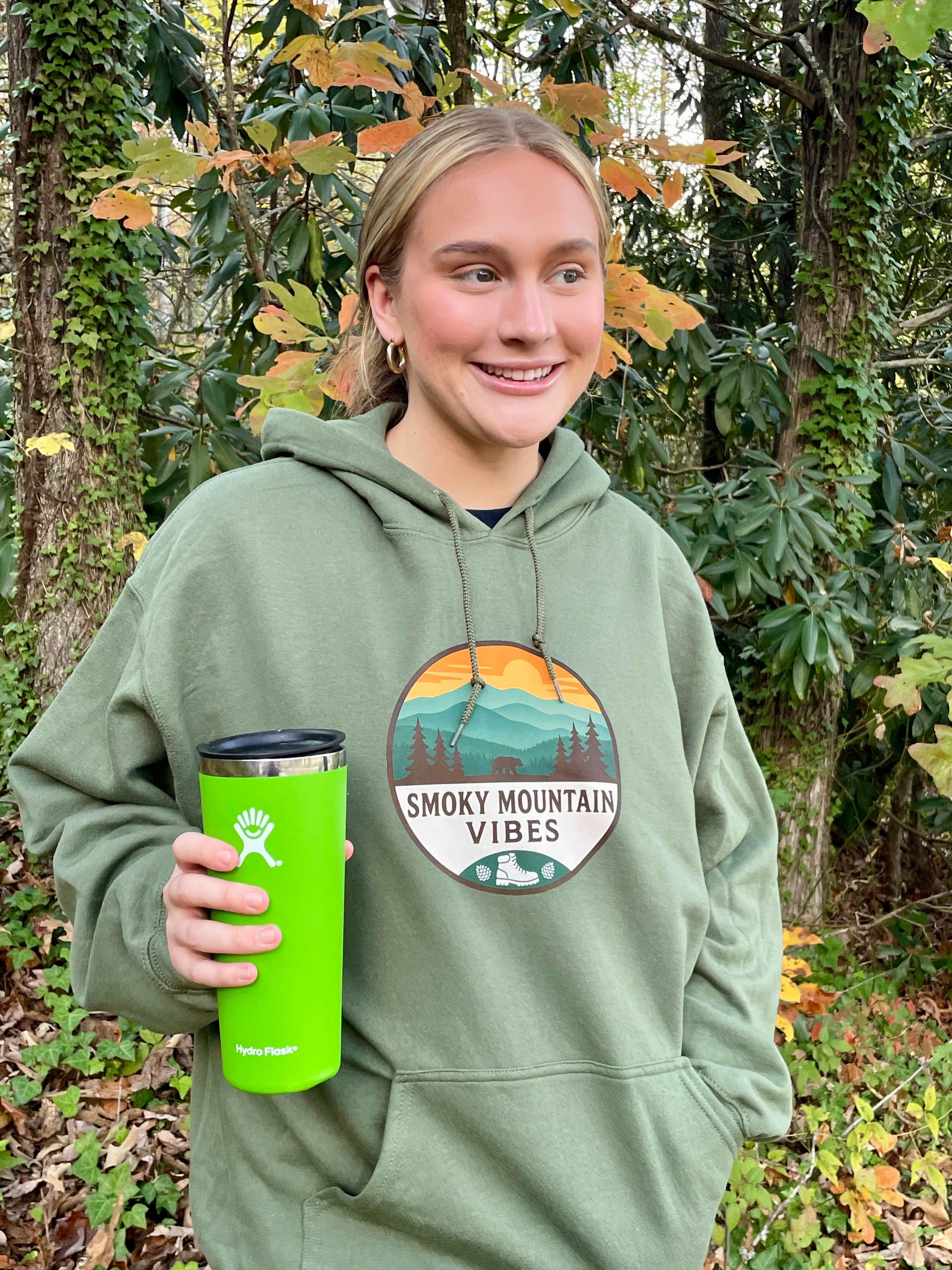 Grab your Smoky Mountain Vibes hoodie today and adventure in comfort!